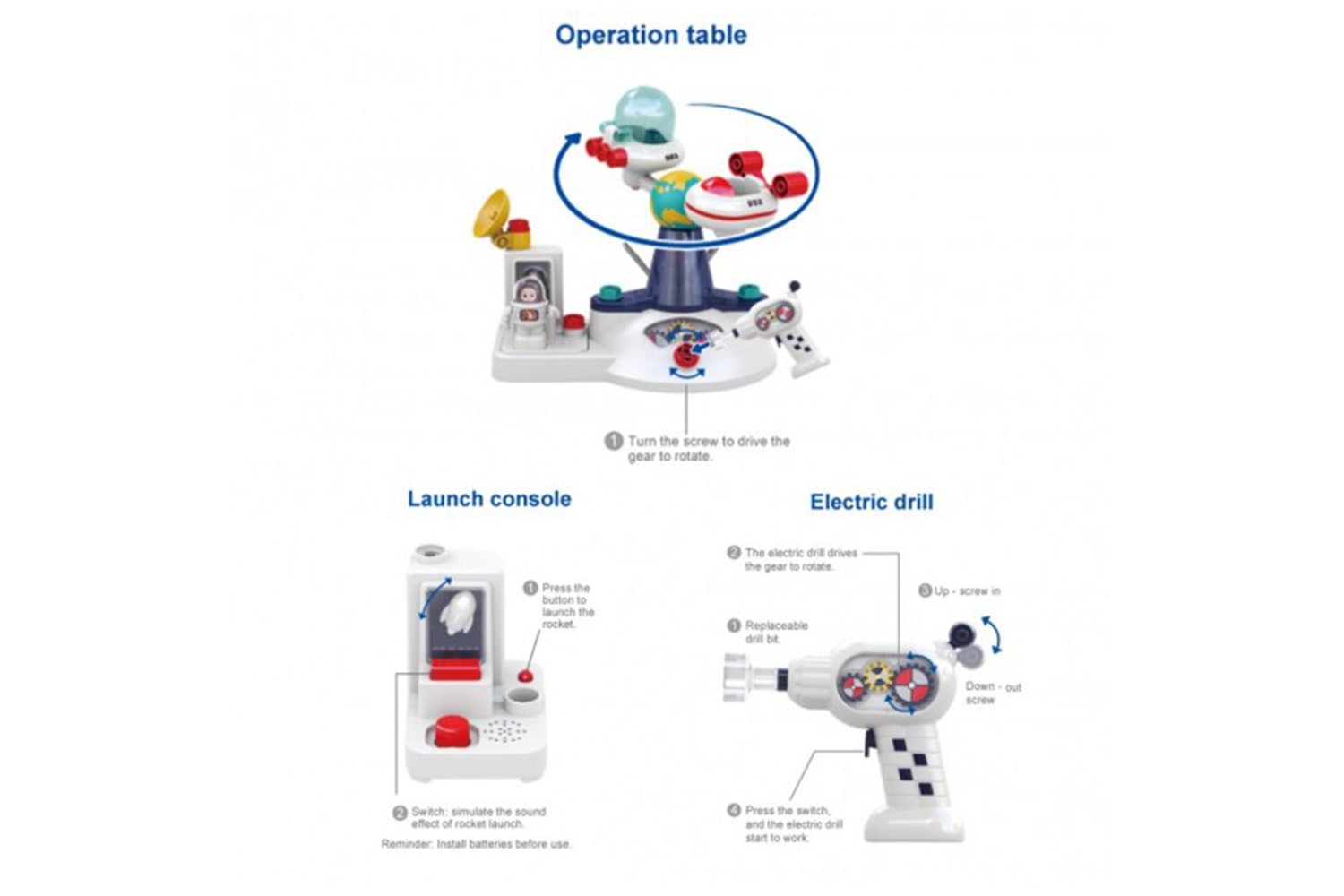 دریل الکتریکی نیز با فشار دادن دکمه شروع به کار و چرخیدن میکند و چرخدندههای داخل آن نیز میچرخند. این دریل دارای ۲ مته است که قابلیت جابجایی دارند. با وصل کردن دریل به پایگاه تحقیقاتی و فشار دادن دکمه، سفینههای روی پایگاه شروع به حرکت و چرخیدن میکنند. همچنین آدمکهای فضانورد را میتوانید روی سفینهها و یا ماشینها قرار دهید.