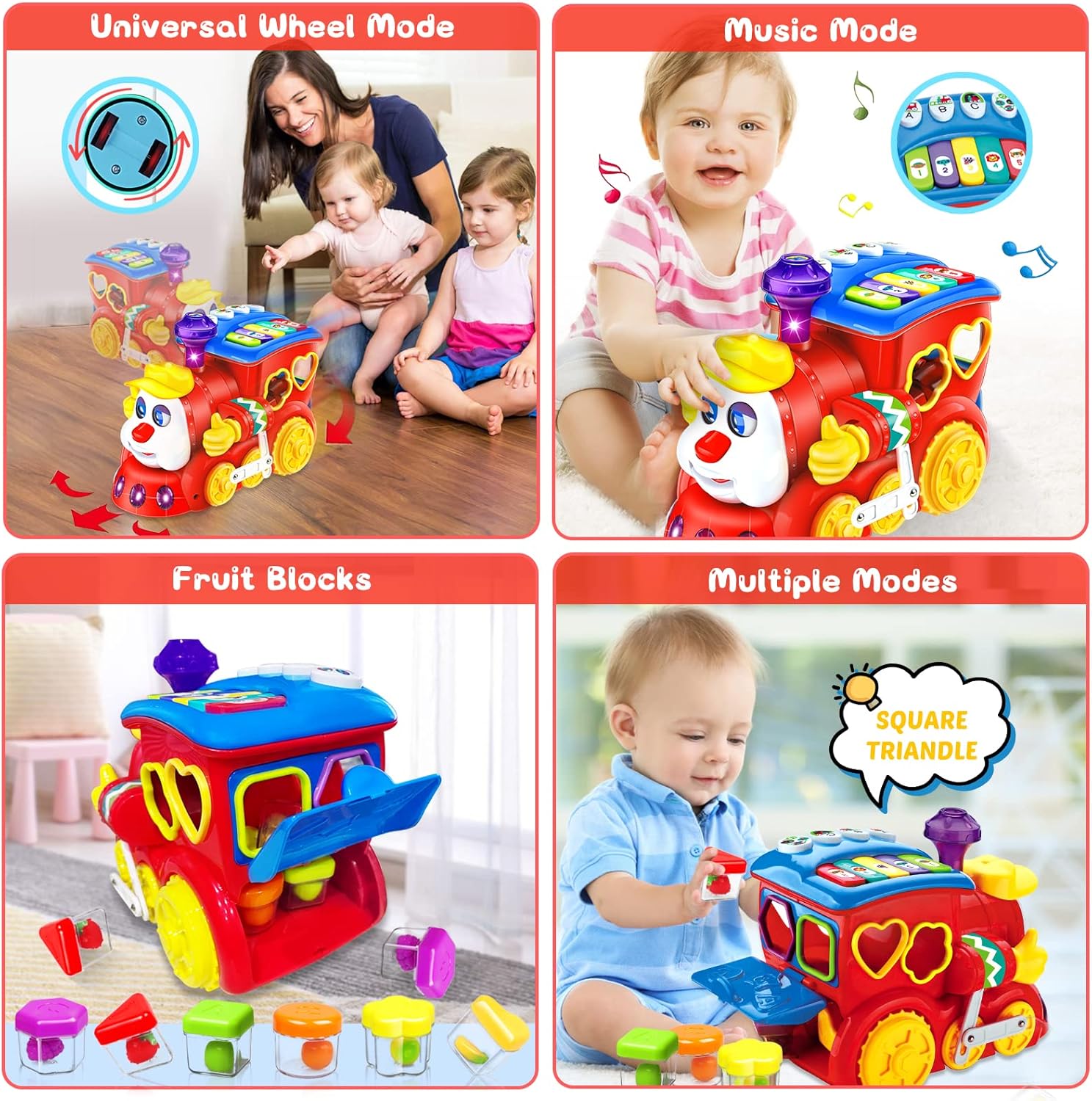 این اسباب بازی موزیکال ۴ حالت مختلف دارد که با دکمه بالای قطار آن را تغییر میدهید.