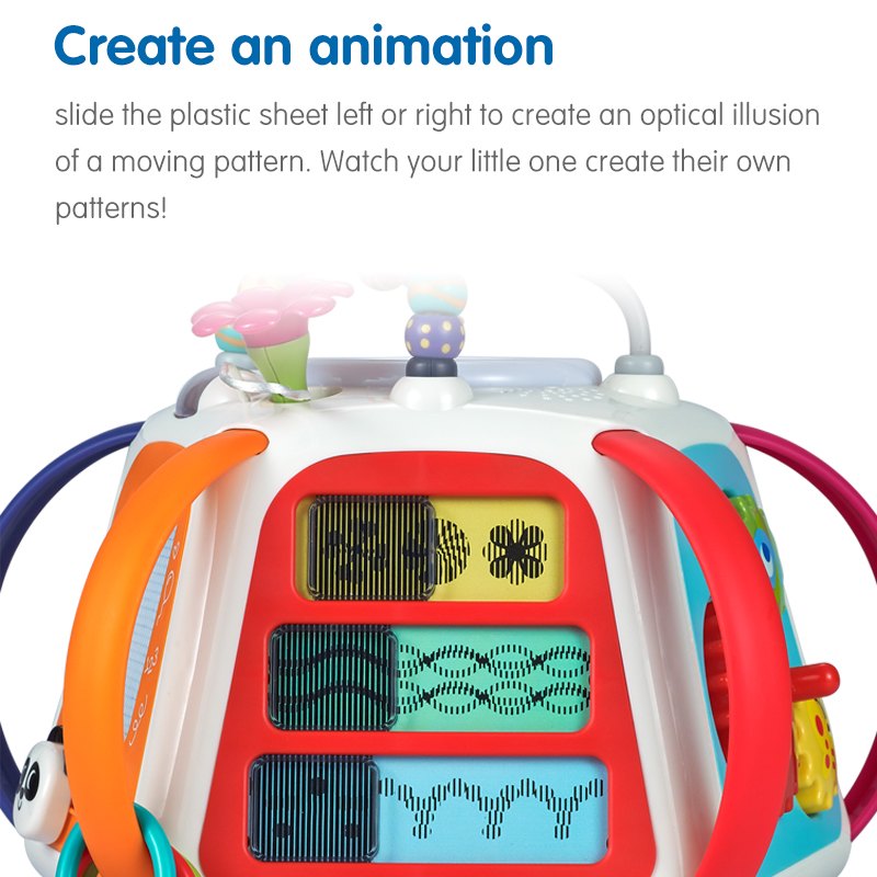روی بدنه آن دستگیره های رنگی ای وجود دارد که با کمک آن ها کودک می تواند مکعب را حمل کند.
