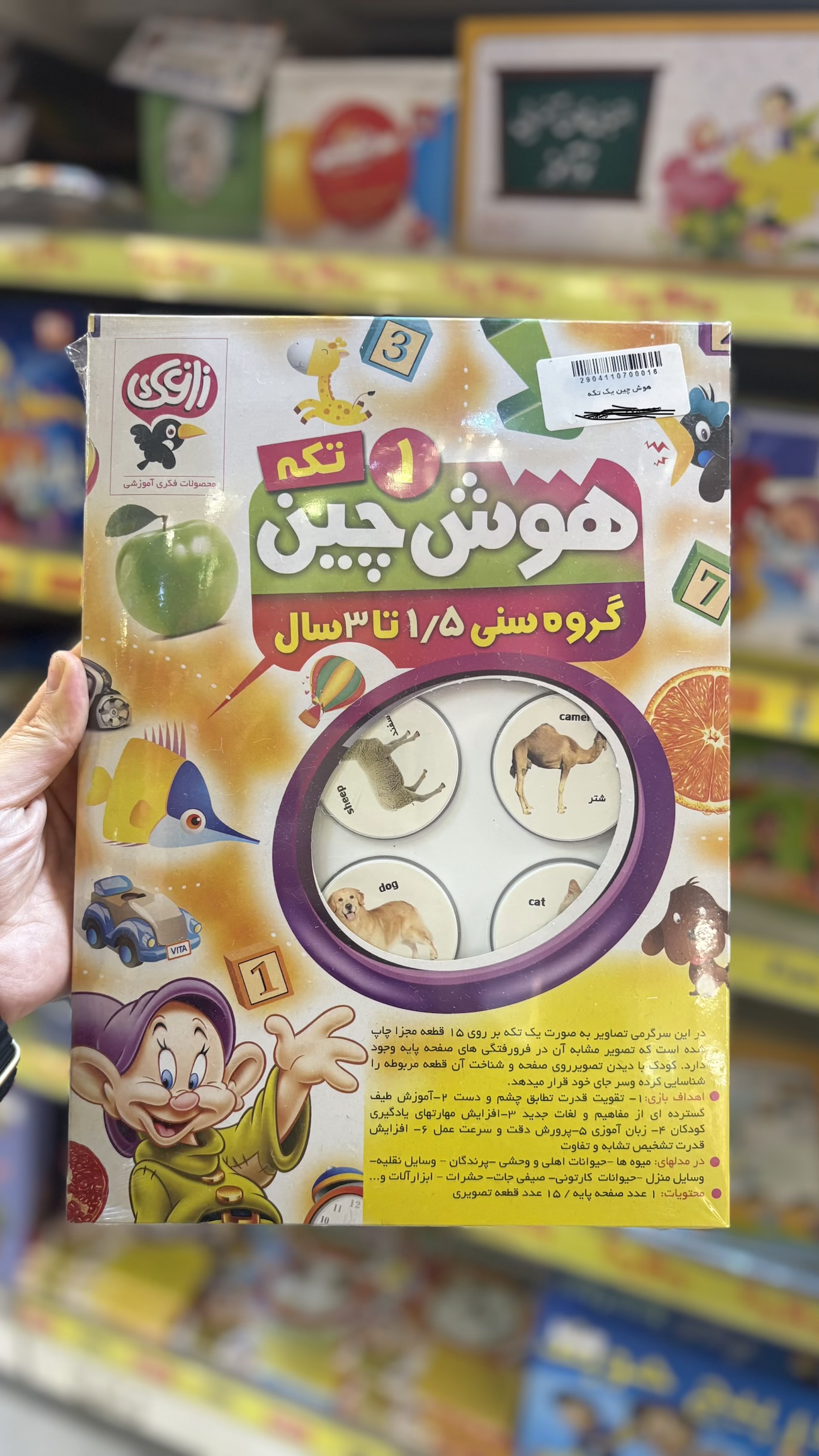 هوش چین یک تکه، یک پازل تصویری جذاب و آموزشی برای کودکان 1.5 تا 3 سال است که با هدف تقویت هوش و مهارتهای گوناگون طراحی شده است. این بازی فکری، شامل یک صفحه پایه و 15 قطعه مجزا با تصاویر رنگارنگ و جذاب است. هر قطعه تصویری، مشابه فرورفتگیهای روی صفحه پایه طراحی شده است.