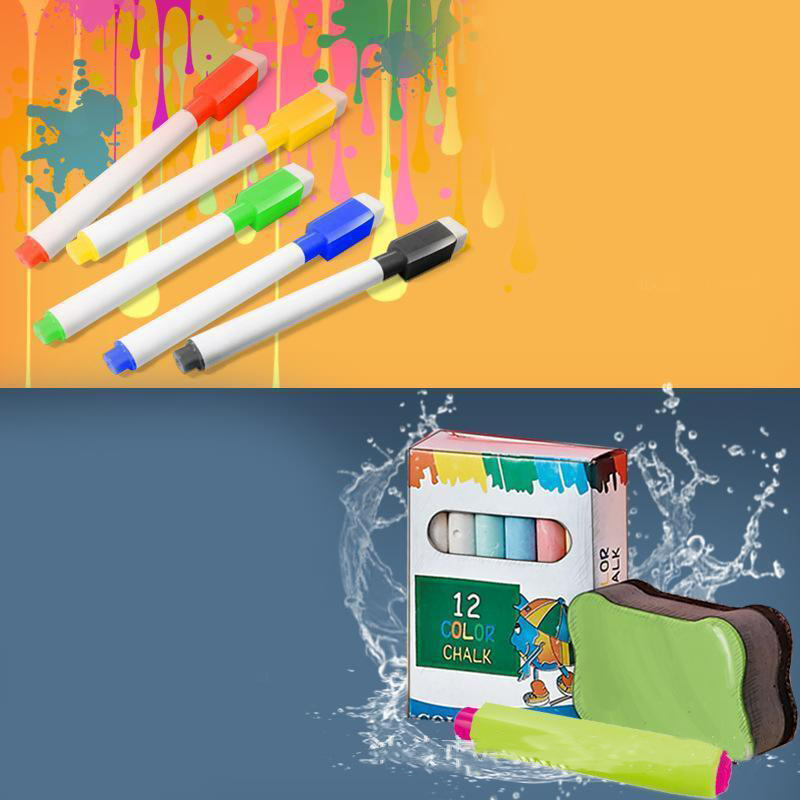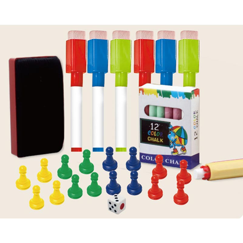 - اقلام همراه: یک بسته 12 عددی گچ، 5 عدد ماژیک، نگهدارنده گچ، تخته پاک کن، اسباب بازی منچ، صفحه بازی منچ و صفحه بازی مارپله