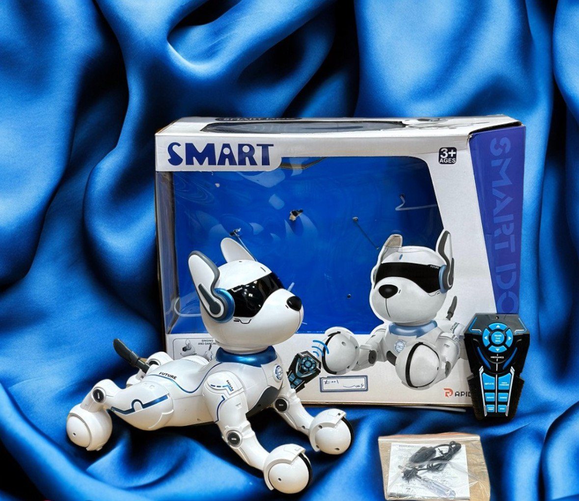- طراحی مدرن و جذاب: با بدنهای سفید رنگ و جزئیات آبی، این سگ رباتیک ظاهری شیک و مدرن دارد که توجه هر کودکی را به خود جلب میکند. عینکهای محافظ و گردنبند آبی، جلوهای خاص به آن بخشیده است.