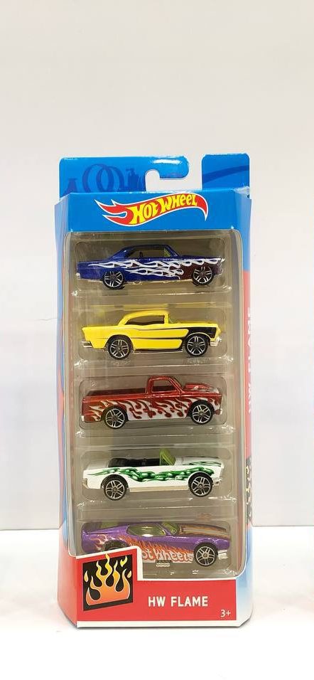 - ۵ ماشین منحصر به فرد Hot Wheels: این ست شامل پنج مدل ماشین مختلف است که هر کدام با طراحیها و رنگهای جذاب و طرحهای شعلهور (Flame) تزیین شدهاند.