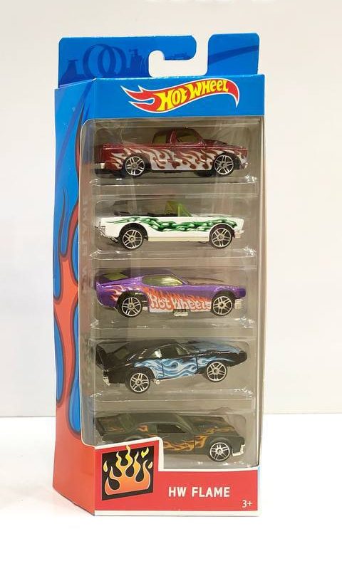 - ۵ ماشین منحصر به فرد Hot Wheels: این ست شامل پنج مدل ماشین مختلف است که هر کدام با طراحیها و رنگهای جذاب و طرحهای شعلهور (Flame) تزیین شدهاند.