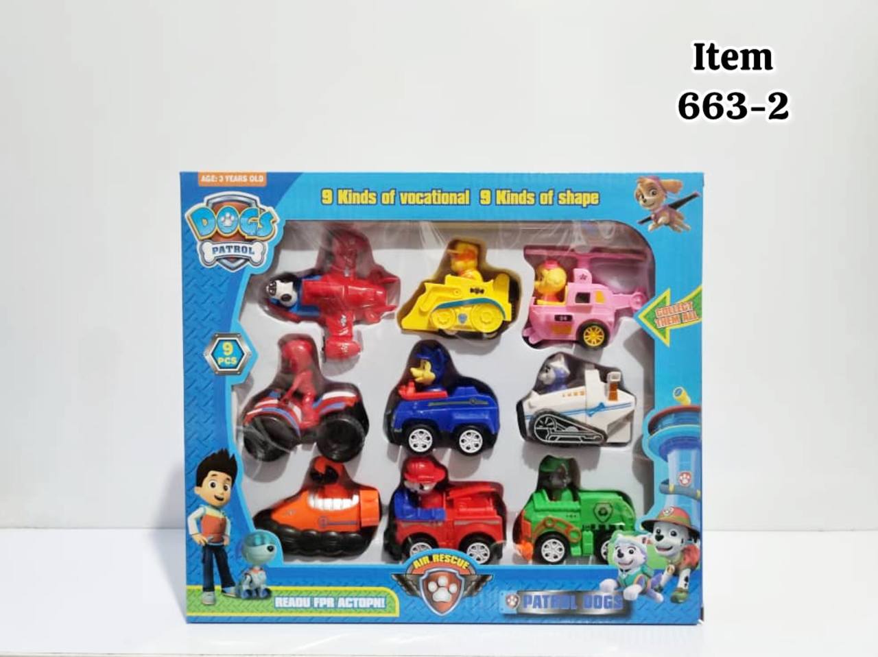 - مجموعه 9 عددی: این پک شامل 9 وسیله نقلیه و 9 سگ نگهبان با طرحها و رنگهای مختلف است که هر کدام ویژگیهای منحصر به فرد خود را دارند.