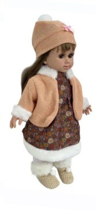 لباس ظریف و زیبای نارنجی رنگ با طرح گلهای ریز، همراه با کلاه بافتنی و ژاکت گرم و نرم، این عروسک را به یک شاهزاده خانم دوستداشتنی تبدیل کرده است. جزئیات دقیق در طراحی لباس، از جمله حاشیههای پشمی و بافت ظریف پارچه، زیبایی بصری این عروسک را دوچندان میکند.