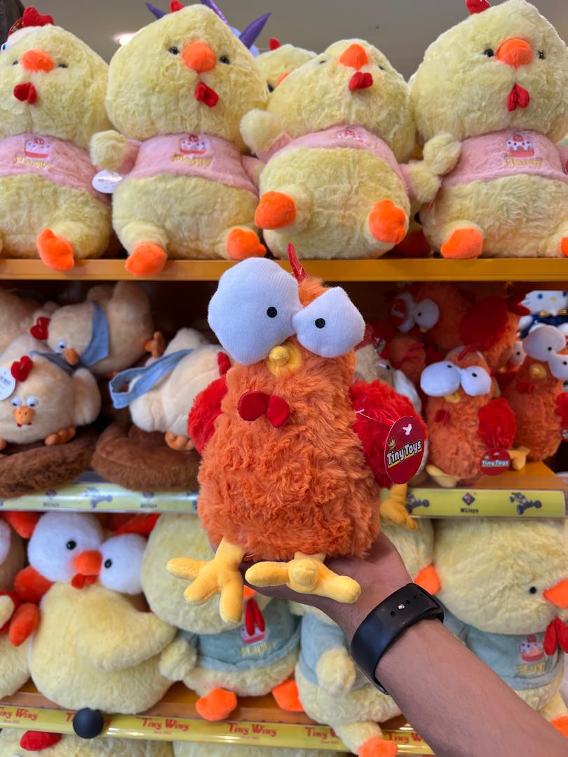 - طراحی کارتونی و پرشخصیت: این عروسک مرغ با رنگ نارنجی زنده، چشمهای بزرگ و سفید با مردمکهای کوچک، نوک زرد و تاج و بالهای قرمز، ظاهری بسیار بامزه و کمی “شلوغ” دارد که تداعیگر شخصیتهای کارتونی است. این طراحی خاص، آن را از سایر عروسکها متمایز میکند.