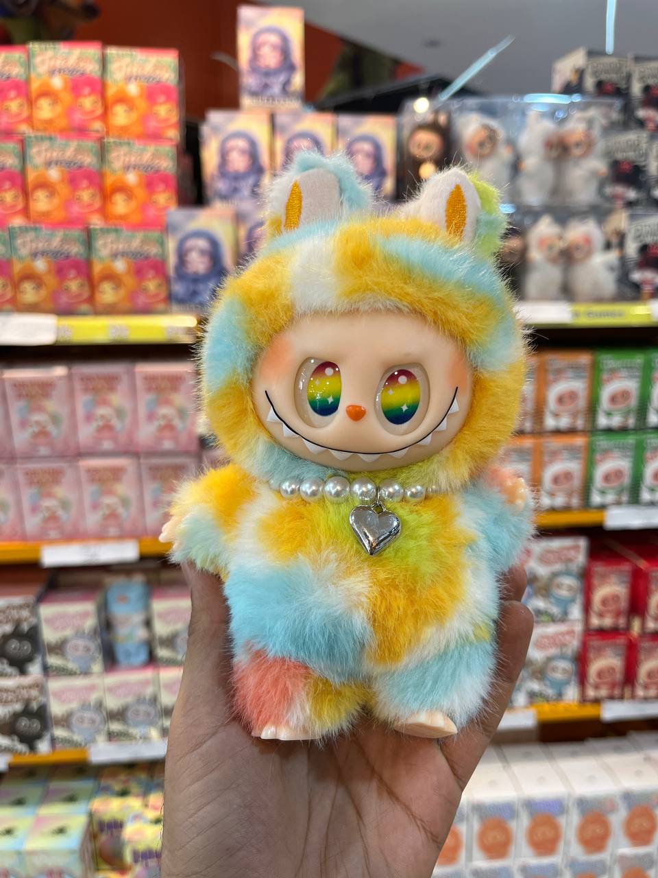 لبوبو، با پوششی پشمالو و رنگارنگ که رنگهای رنگینکمان را در خود جای داده، مثل یک جعبه مداد رنگی زنده است. این ترکیب رنگ بینظیر، نه تنها به زیبایی ظاهری آن میافزاید، بلکه حس سرزندگی و نشاط را نیز به همراه دارد.