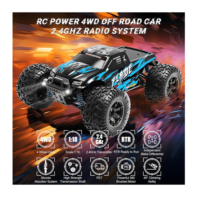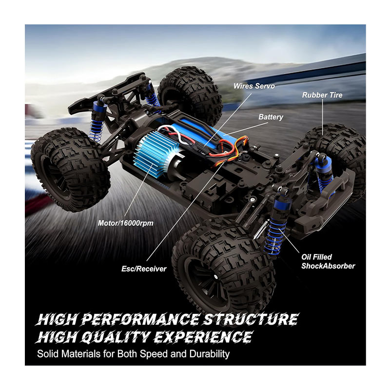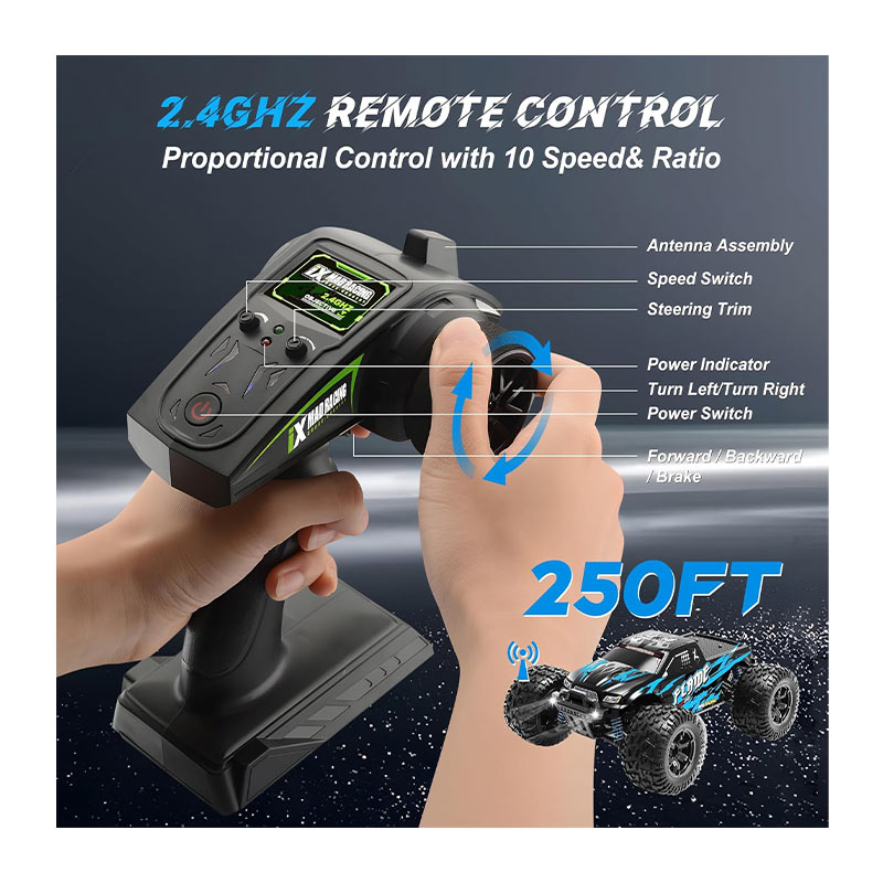 - ریموت کنترل بیسیم: دارای ریموت کنترل 2.4 گیگاهرتزی با برد کنترل 60 تا 80 متر، که به شما اجازه میدهد حتی در مسافتهای طولانی نیز کنترل دقیقی روی ماشین داشته باشید.