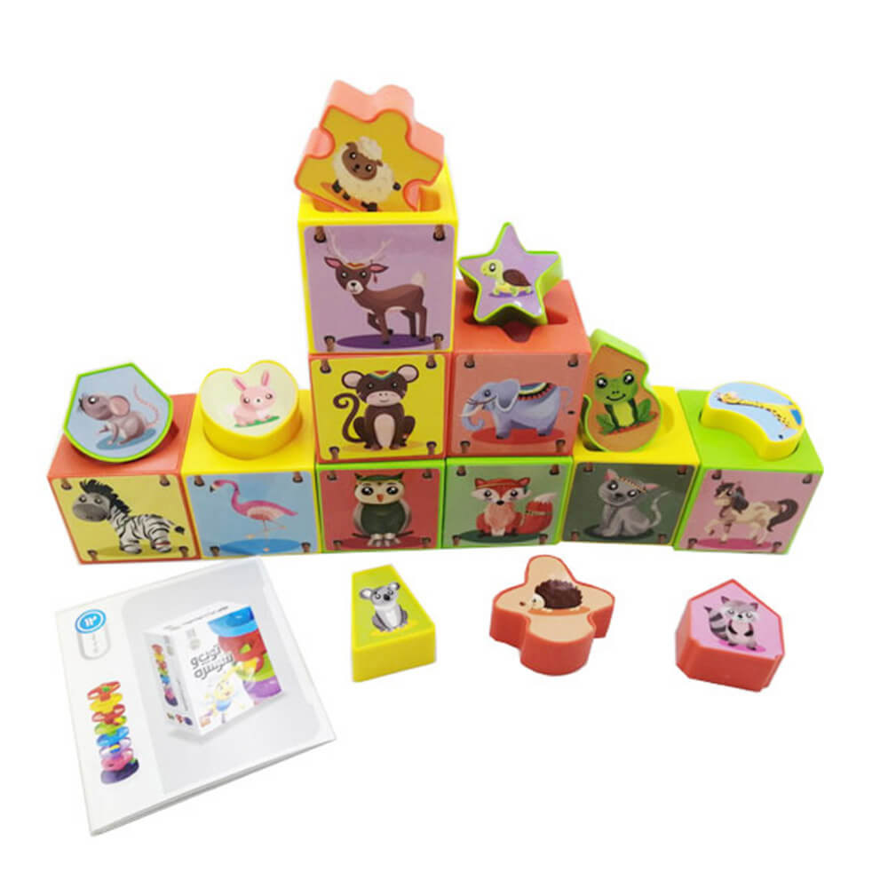در طرف دیگر هر مکعب تصاویر حیوانات مختلف قرار دارد. از کودک بخواهید که شکل مشابه با حفره روی مکعب را بیابد و آن را در جای خود قرار دهد حال مکعب دیگری را پیدا کند که مثل مکعب قبلی حفره ای به آن شکل داشته باشد و مکعب را از طرف حفره دارش روی شکل جاگذاری شده قرار دهد. به همین ترتیب ادامه دهد تا برجی از حیوانات مختلف ساخته شود.