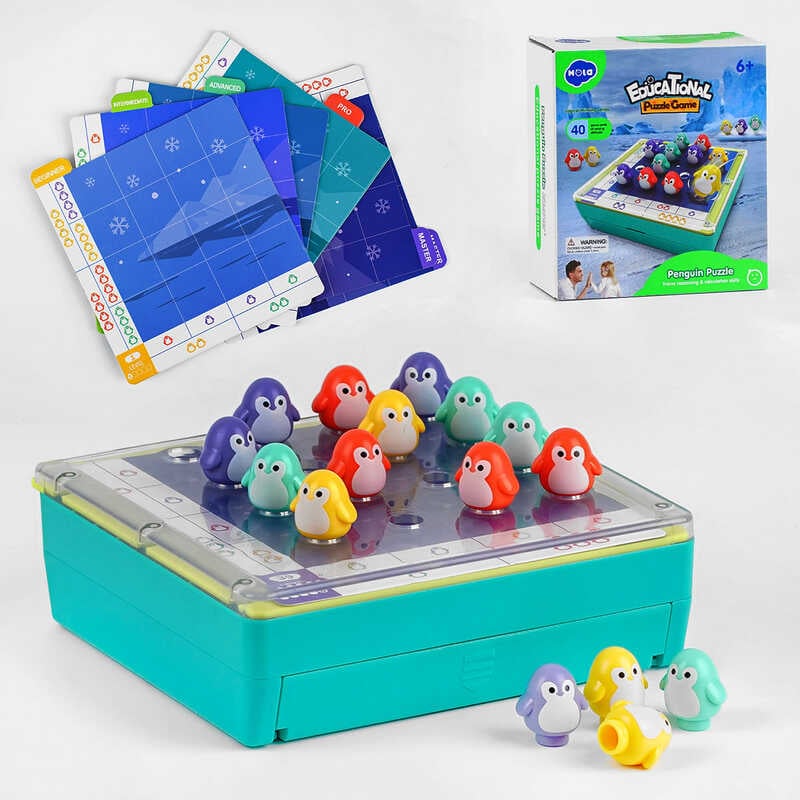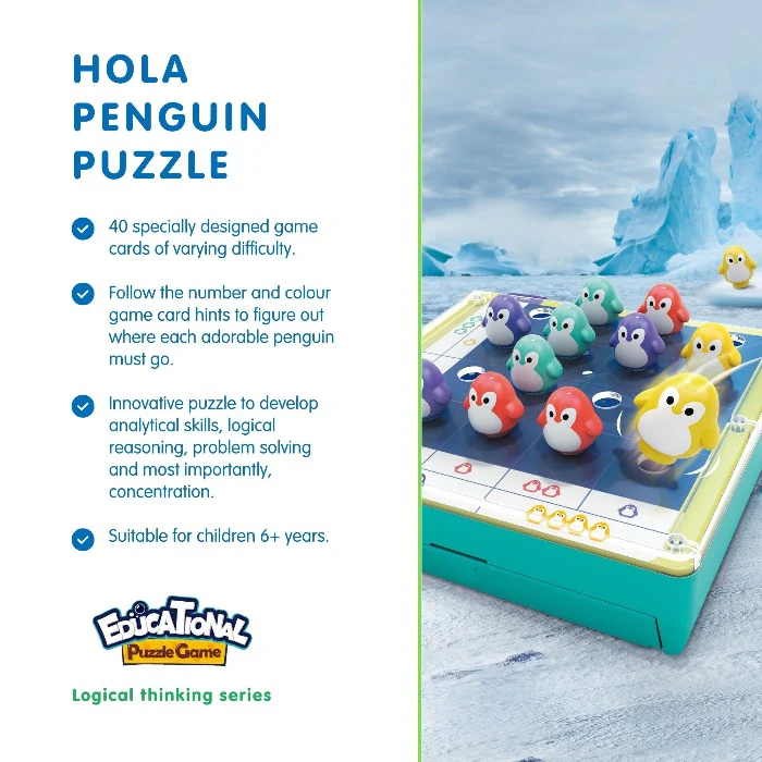 پازل پنگوئن هولا از 16 پنگوئن در رنگ های مختلف و40 کارت بازی تشکیل شده و یک اسباب بازی ایده آل است