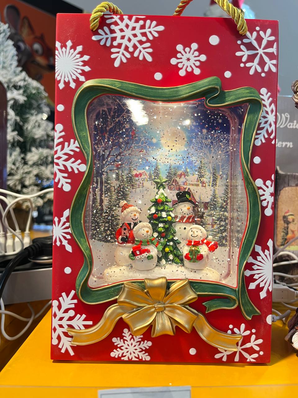 بدنه این چراغ خواب به شکل یک جعبه کادویی قرمز رنگ با دانههای برف سفید تزئین شده، که حس و حال کریسمسی را به خوبی القا میکند. در مرکز این جعبه، قابی سبز رنگ وجود دارد که منظرهای زمستانی را در خود جای داده است. در این منظره برفی، آدم برفیهای دوستداشتنی در کنار درختی تزئین شده منتظر رسیدن سال نو هستند و بارش برف مصنوعی، جلوهای سحرآمیز به آن بخشیده است.