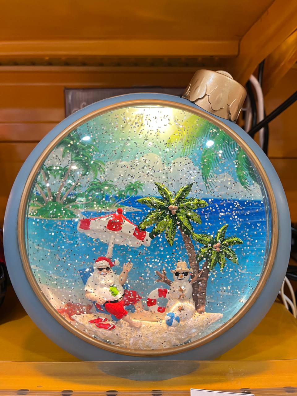 تصور کنید بابانوئلی را که با لباس شنا و عینک آفتابی، زیر سایه یک چتر رنگی، در کنار آدم برفی دوستداشتنی خود نشسته است و از گرمای آفتاب لذت میبرد. درختان نخل سر به فلک کشیده، دریای آبی و آسمانی با ابرهای پراکنده، همگی در یک گوی شیشهای جادویی گرد هم آمدهاند تا یک منظره ساحلی رویایی را به تصویر بکشند.